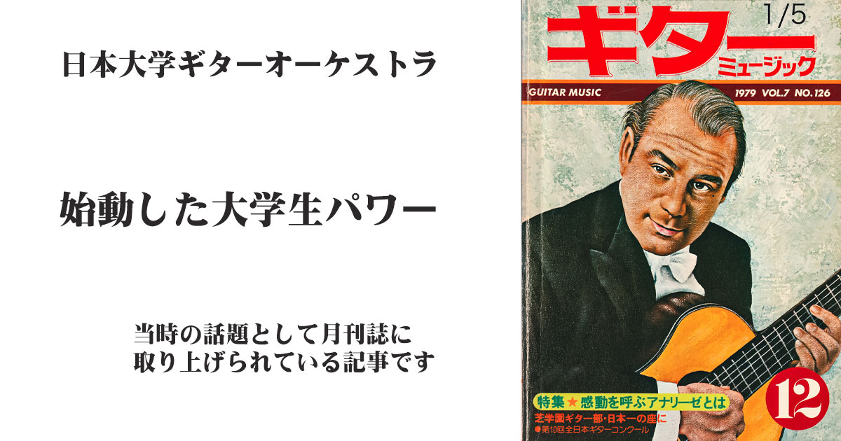当時のギターオーケストラの記事(ギターミュージック 1979年) 2026 2/02 日本大学ギターオーケストラOB会のページ 日本大学ギターオーケストラOB会ポータル 2026年2月2日 「始動した大学生パワー」と言う記事を見つけてくれました。当時の月刊誌です・・・私も知らなかった記事ですね・・というより私出てるじゃん・・・、単に忘れてたのでしょうね・・・・ 当時の部員、みんないい顔してますねーーー 1 2 3 4 5 OMNYWAY|オムニウェイ 関東エリアを中心にネットショップ構築、オンラインコーチをしてから17年。 ECサイト(ネットショップ)にまつわることや写真撮影、ネット実務、AI生成まで多岐にわたってご対応しております。 どんなことでもお気軽にお問い合わせください。 日本大学ギターオーケストラOB会のページ 日本大学ギターオーケストラOB会ポータル よかったらシェアしてね! URLをコピーしました! URLをコピーしました! 第11回日本大学ギターオーケストラ 定期演奏会(レギュラーコンサート プログラム) 関連記事 第11回日本大学ギターオーケストラ 定期演奏会(レギュラーコンサート プログラム) 2026年2月2日 日本大学ギターオーケストラ第3回リサイタル(プログラム) 2026年2月1日 半世紀前の大学OB会が、LINEグループを作ったら盛り上がってる件 2026年1月30日 保護中: ポータル・日本大学ギターオーケストラ OB会 2026年1月28日 日本大学ギターオーケストラ 第2回コンサート「X’mas Consert」(プログラム) 2026年1月26日 日本大学ギターオーケストラ第1回コンサート(プログラム) 2026年1月25日